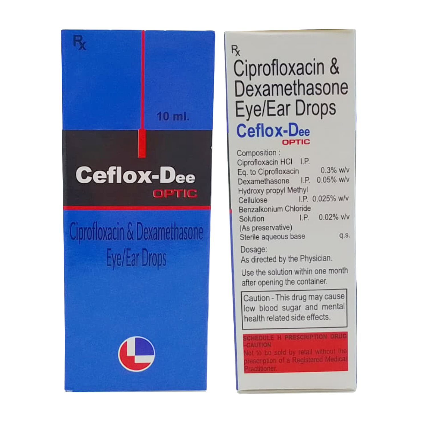 Composition :Ciprofloxacin HCI I.P. Eq. to Ciprofloxacin 0.3% w/v Dexamethasone I.P. 0.05% w/v Hydroxy propyl Methyl Cellulose I.P. 0.025% w/v Benzalkonium Chloride Solution I.P. 0.02% v/v (As preservative) Sterile aqueous base q.s.