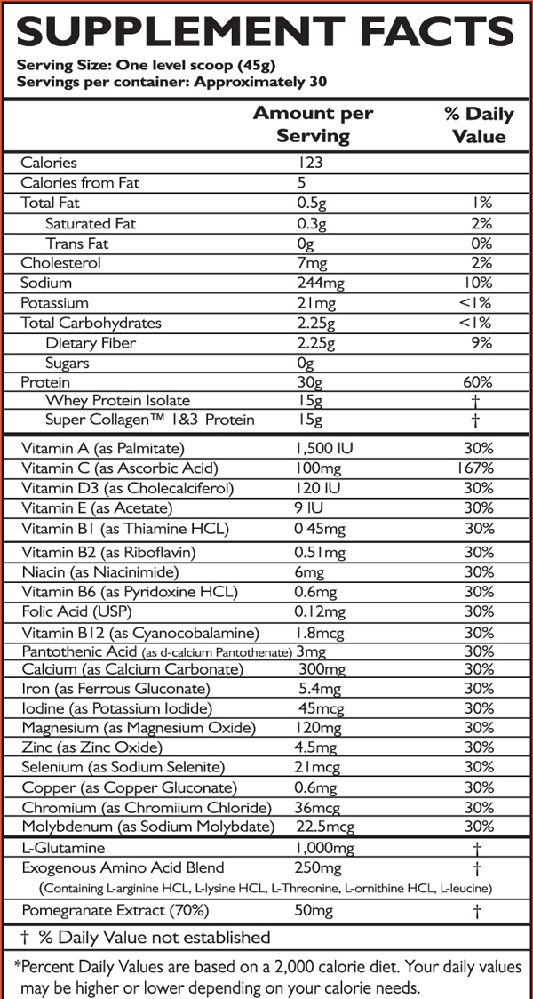 Whey protein isolate (containing alpha and beta lactoglobulins, immunoglobulin, bovine serum albumin (BSA), lysozymes, glycomacropeptides, lactoferrin, lactoperoxides, and lysozyme), super collagen hydrolyzed peptides, fiber blend (inulin, guar gum, rice bran, apple pectin), natural vanilla flavor, xylitol (natural sweetener)
